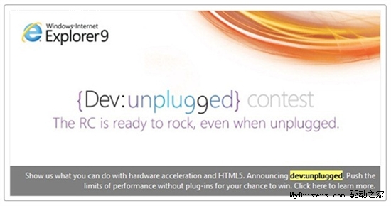 今天早些時(shí)候有媒體披露了“IE9盡享網(wǎng)絡(luò )之美”網(wǎng)站上的一個(gè)神秘新頁(yè)面“Dev:unplugged”,之所以說(shuō)它神秘是因為微軟沒(méi)有提供任何信息,只是說(shuō)不久就會(huì )有史詩(shī)性事件發(fā)生,這莫非是在說(shuō)IE9正式版發(fā)布?