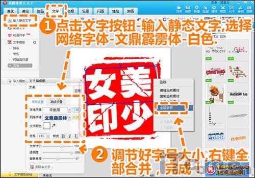 3.接著(zhù)進(jìn)入“文字”菜單下,選擇輸入靜態(tài)文字,點(diǎn)擊網(wǎng)絡(luò )字體,選擇文鼎霹靂體,顏色-白色,調節每個(gè)文字的顏色、方向、大小、字與字之間的間距等參數,最后鼠標右鍵“全部合并”,第一個(gè)網(wǎng)絡(luò )圖章就做好了。