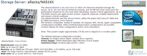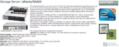 據國外媒體PRWeb最新報道,美國西部時(shí)間7月5日,PC廠(chǎng)商eRacks Open Source Systems宣布推出采用最新至強處理器的兩款NAS系列服務(wù)器,它們分別是eRacks/NAS6X和eRacks/NAS16X。這兩款產(chǎn)品主要針對大規模部署和關(guān)鍵業(yè)務(wù)應用。這兩款產(chǎn)品最多可以支持4個(gè)或者8個(gè)CPU,每個(gè)處理器支持最高10個(gè)內核和30MB的緩存。