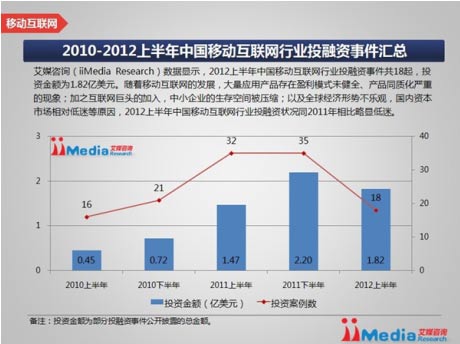 來(lái)自艾媒的數據顯示,2012年上半年獲得融資的案例是18起,數量較2011年下半年的35起比例下降49%,較去年同期的32起下降44%。