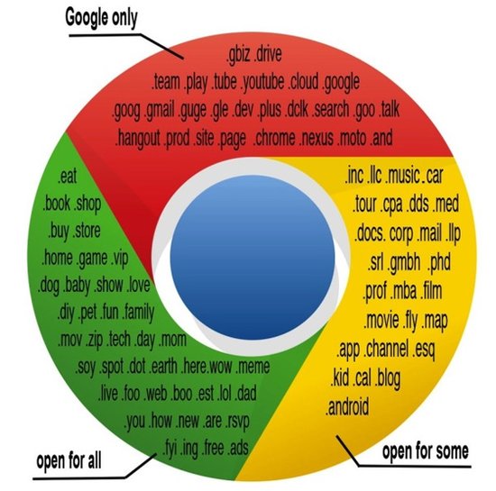 據ICANN稱(chēng),新提出的通用頂級域名共有1900多個(gè),其中谷歌申請的新頂級域名有101個(gè),比如“.google”、“.chrome”、“.gmail”、“.goog”和“.youtube”等。除了這些具有強烈的谷歌特色的域名之外,它還申請了一些任何組織都可以使用的頂級域名,包括“.search”、“.app”、“.blog”和“.cloud”等。