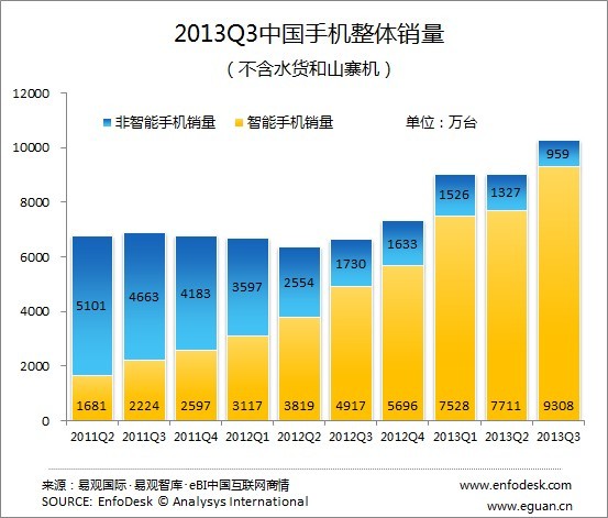 易觀(guān)智庫:2013Q3中國手機銷(xiāo)量突破1億 TD-SCDMA占四成