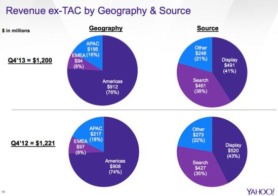雅虎亞太地區的營(yíng)收從2012財年的11億下跌至2013財年的8.14億美元,下滑23%。從雅虎投資分析圖表可見(jiàn)亞太業(yè)務(wù)占據雅虎全球營(yíng)收的份額一年內從18%降至16%。
