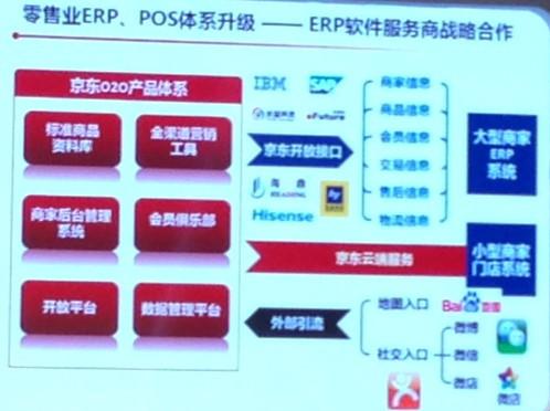 簽約萬(wàn)家便利店的同時(shí),京東和ERP軟件服務(wù)商SAP、IBM、海鼎、富基融通、宏業(yè)、海星、長(cháng)益等也簽訂戰略合作協(xié)議,共同實(shí)現零售業(yè)ERP系統和京東平臺對接,升級零售業(yè)ERP系統,滿(mǎn)足門(mén)店庫存全渠道銷(xiāo)售所需和所有交易環(huán)節、結算環(huán)節、物流服務(wù)環(huán)節、售后客服環(huán)節的可視化,支持京東電子會(huì )員卡和手機支付功能。