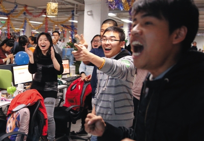 部分員工看著(zhù)不斷攀升的銷(xiāo)售額,發(fā)出歡呼。新京報記者 李冬 攝
