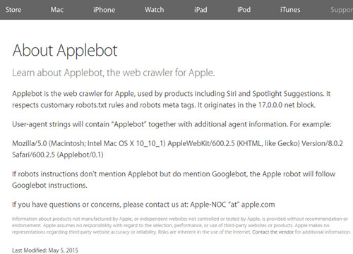 【TechWeb報道】5月7日消息,蘋(píng)果在官網(wǎng)的技術(shù)支持網(wǎng)站中,添加了一個(gè)新頁(yè)面,來(lái)具體介紹其首款網(wǎng)絡(luò )爬蟲(chóng)機器人。