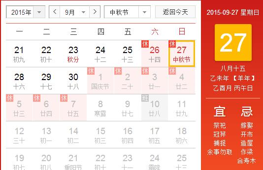 2015中秋節國慶節放假安排