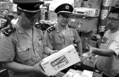當天下午,根據商標權利人的舉報,海淀工商分局出動(dòng)數十名執法人員,對中關(guān)村電子市場(chǎng)的電腦、電腦配件、相機配件、復印機耗材、版紙等產(chǎn)品進(jìn)行突擊檢查。在科貿電子城3層的一個(gè)商鋪,執法人員發(fā)現大量假冒名牌辦公耗材,打假人員初步鑒定為侵權產(chǎn)品。而在該電子城4層的一家商鋪,執法人員發(fā)現,商戶(hù)的辦公耗材從外包裝和外表看,像真的,但是打開(kāi)發(fā)現,里面的商標明顯與真品不一樣。此外,執法人員還發(fā)現大量空的佳能包裝盒。