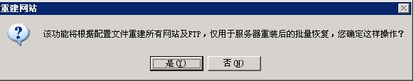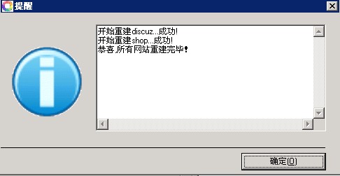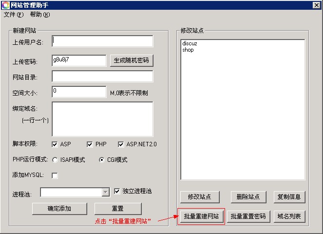 3、點(diǎn)擊提示對話(huà)框,會(huì )自動(dòng)打開(kāi)“網(wǎng)站管理助手”,點(diǎn)擊“批量重建站點(diǎn)”,系統會(huì )自動(dòng)重建用戶(hù)賬戶(hù)、IIS站點(diǎn)、FTP和mysql。重建成功后會(huì )有相應提示。