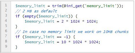 說(shuō)明:首選讀取php.ini配置文件中的內存配置選項memory_limit,如果為空則默認內存大小限制為2M,如果沒(méi)有限制則內存大小限制為10M,你可以結合你php.ini配置文件中的相關(guān)信息修改這段代碼。
