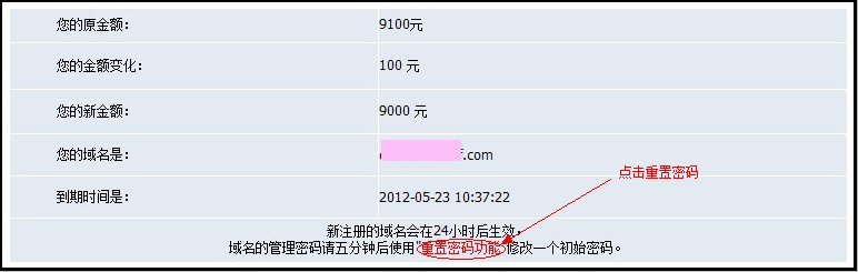 系統會(huì )提示您的域名到期時(shí)間和重置密碼的提示:新注冊的域名會(huì )在24小時(shí)后生效,域名的管理密碼請五分鐘后使用"重置密碼功能"修改一個(gè)初始密碼。點(diǎn)擊“重置密碼功能”,如圖: